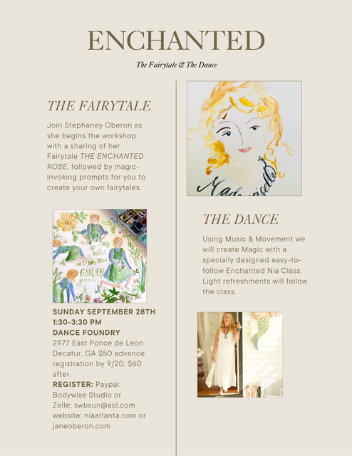 NEW WORKSHOP IN DECATUR, GEORGIA. Join Stephaney September 28th for ENCHANTED - The Fairytale & The Dance at Dance Foundry. 1:30-3:30 with a light refreshments following the workshop. As one of the original Nia trainers, Stephaney Oberon continues to offer opportunities to heal body mind and spirit through movement.